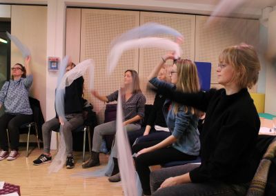 Am 11.02.2019 haben sich 15 Teilnehmerinnen und Teilnehmer der Lebenshilfe Aschaffenburg, der Lebenshilfe Schmerlenbach und dem St. Josefs- Stift Eisingen zusammen mit der Referentin Bernadette Goletzko fortgebildet. Eingeladen hat der Bereich Freizeit, Begegnung, Bildung der Offenen Hilfen der Lebenshilfe Aschaffenburg. Auf eine locker beschwingte Art und Weise wurde sich zu nationaler und internationaler Musik oder auch zu volkstümlichen Liedern bewegt. Sitztanz ist eine Bewegungs-Methode, die sehr viel Spaß macht und bei der einfach jeder mitmachen kann. Mit vielen Accessoires wurden die Tänze aufgelockert und allen Teilnehmern ein Lächeln ins Gesicht gezaubert.