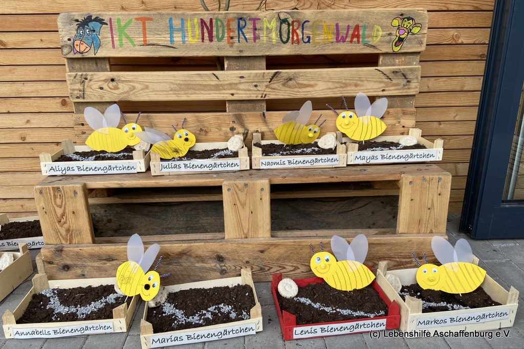 In Alzenau wurde fleißig an einer Gemüs,-, Kräuter-, Blumenraupe aus alten Weinkisten gebaut und gepflanzt. Jetzt schlängelt sie sich durch den Vorgarten und wartet auf ihre brummenden Besucher. Die Alzenauer mit ihren „Großen“ Kindern waren sogar so gut unterwegs, dass sie die Tanzsprache der Bienen kennengelernt und selbst getanzt haben. Ganz ehrlich, wer kennt wohl nicht den „Rund- oder Schwänzeltanz“ also wir in Mömbris sind mit unserem Altersdurchschnitt von 2,4 Jahren gut und gerne zwei Jahre von diesen Tänzen entfernt. Aber großes Kompliment an die Alzenauer Kolleginnen.