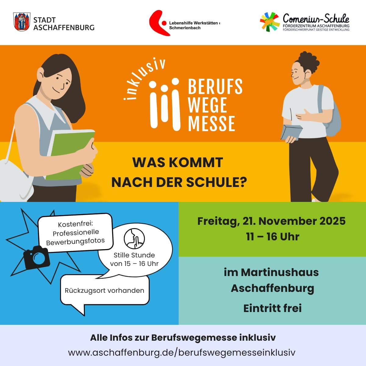 Auf der Berufswegemesse inklusiv können sich junge Menschen mit Förderbedarf und ihre Familien oder Begleitpersonen selbstbestimmt und zeitgemäß zum Übergang in das Berufsleben informieren. Dabei stehen vor allem Jugendliche mit Lernschwierigkeiten oder kognitiven Beeinträchtigungen im Fokus. Über 30 Arbeitgeber*innen, Bildungseinrichtungen, Beratungsstellen und weitere Einrichtungen aus dem Bereich Teilhabe und Arbeitsleben sind mit einem Stand auf der Messe vertreten.