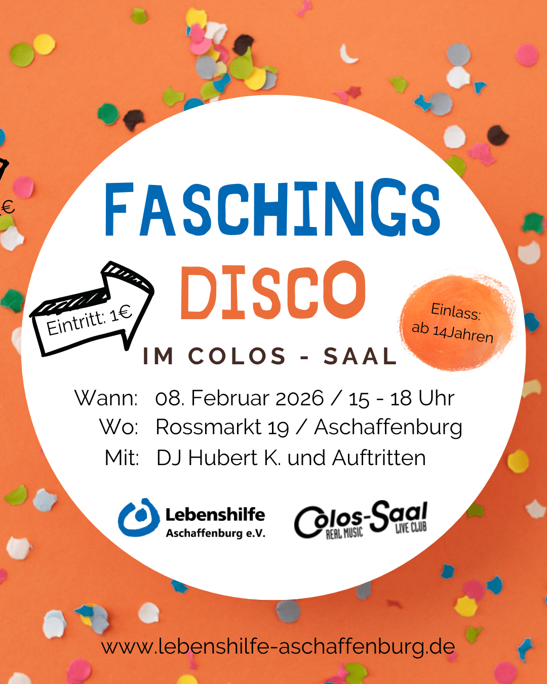 Am Sonntag, den 8. Februar ist es wieder soweit – unsere beliebte Faschings-Disco der Lebenshilfe Aschaffenburg e.V. im Colos-Saal mit DJ Hubert K. findet statt!